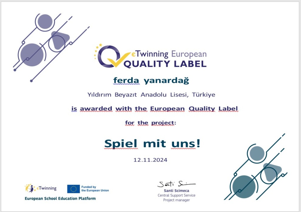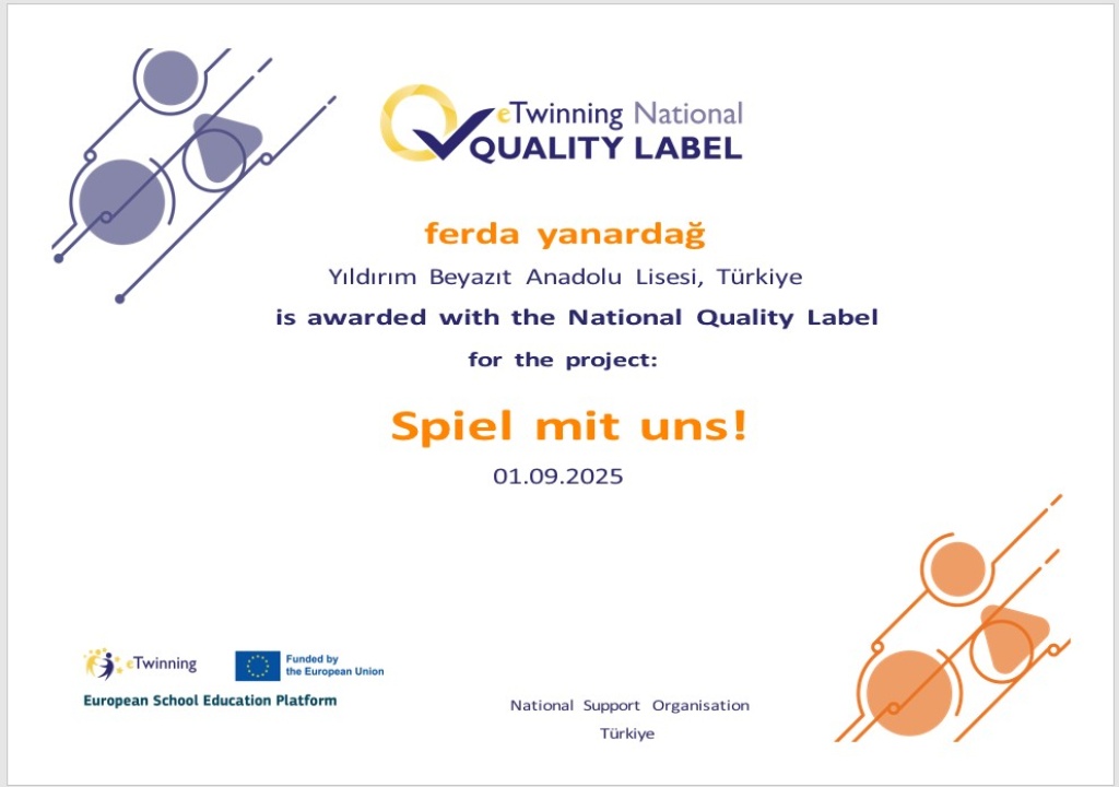 Yıldırım Beyazıt Anadolu Lisesi Almanca öğretmeni Ferda Yanardağ rehberliğinde, 2023-2024 eğitim öğretim yılında yürütülen “Spiel mit uns “adlı eTwinning projesi, Avrupa ve Ulusal Kalite Etiketi almaya layık görüldü.